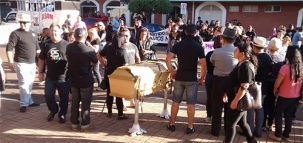 Um caixão de defunto foi usado na tarde desta quinta-feira em passeata de professores em greve pelo centro de Campo Mourão.