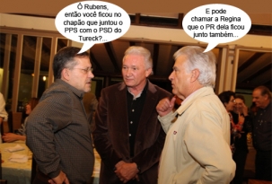 Olha aí o flagra feito neste sábado, durante jantar do Sindicato Rural, no Recanto do Criador. Três ex-prefeitos de Campo Mourão colocando a conversa em dia - Tauillo Tezelli, Nelson Tureck e Rubens Bueno. Juntos, eles têm 20 anos à frente da prefeitura. Tauillo e Bueno são do PPS e Tureck do PSD. Apesar das divergências locais, os partidos estão coligados na eleição para deputado federal, assim como o PR da prefeita Regina Dubay.