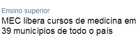 A confirmação das 39 cidades que ganharão curso de medicina foi destaque nesta quinta-feira nos principais meios de comunicação do País. Acima estão as manchetes da Gazeta do Povo, do O Estado de S. Paulo, do UOL e do G1. Isso só na internet. Campo Mourão é um dos 39 municípios escolhidos. E que fique claro: Paranavaí não está na lista...