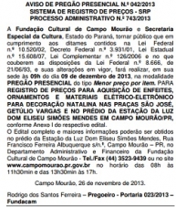 O primeiro será às 9h para aquisiçao de enfeites, e o segundo, às 14h, para contratação de serviços de confecção e instalação de árvores de Natal e portais.