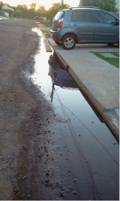 Esta foto é da rua das Acácias, no jardim Araucária. A rua não tem rede de esgoto e nem caída para escoamento de água, o que a torna uma verdadeira lagoa, causando transtorno aos moradores e oferecendo risco de proliferação do mosquito da dengue. O Executivo já foi informado e até agora não se manifestou sobre o caso. Detalhe: esta foto foi tirada ontem, em dia ensolarado, a água acumulada em quase toda a via é a água que é escoada das próprias residências. Quem é o responsável?