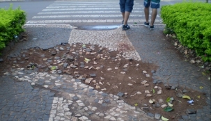 Av. Irmãos Pereira, esquina com rua São Paulo. Os pedestres são obrigados a passar pela calçada esburacada. Ao lado da calçada tem um bueiro entupido há anos". Fraterno Maria Nunes