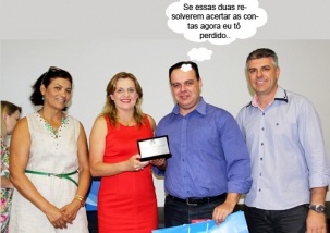 O clic é desta sexta-feira, durante a entrega do prêmio de Servidor de Ano. Doze servidores foram premiados, entre eles Robson Scarpin, que aparece aí na foto. O evento deixou lado a lado a prefeita Regina Dubay e a vereadora Professora Vilma, que andam trocando faíscas. O vereador Edílson Martins completa o clic.