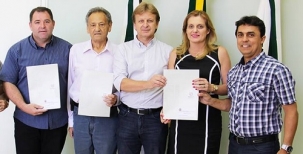 Não foi só para ver a prefeita Regina Dubay assinando convênios que os prefeitos Fabiano Antoniassi (Araruna) e Valdinei Peloi (Ranho Alegre do Oeste) estiveram nesta segunda-feira na prefeitura de Campo Mourão, não. Eles também assinaram seus conveniozinhos. O presidente da Codapar, Tino Staniszewski, e Betinho Lima (Sedu) representaram o governo do Estado. A foto mostra bem a situação: ênio, ênio, ênio, cada um com seu convênio....