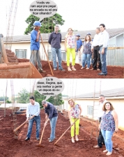 O clic é desta quarta-feira, quando as visitas às obras da prefeita Regina Dubay incluíram o posto de saúde que está em construção do jardim Pio 12. Os vereadores Toninho Machado e Edílson Martins acompanharam e, como dá pra ver, todo mundo teve que pegar no cabo da enxada. Ô dureza!...