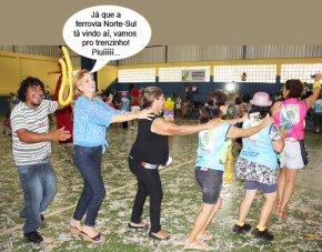 O clic é de domingo, na matinê de carnaval promovida pela prefeitura no ginásio de esportes do jardim Aeroporto. Assim como tinha feito sábado no Lar Paraná, a prefeita Regina Dubay esteve presente e entrou na folia, com direito a trenzinho e tudo. Ah, já que a ferrovia Norte-Sul, dizem, tá vindo aí, né?...