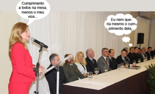 O clic é da sessão solene da Câmara que entregou o título de Cidadão Honorário ao diretor-secretário da Coamo, Ricardo Calderari. Na hora do discurso, a prefeita Regina Dubay cumprimentou a todos na mesa, menos o vice-prefeito Rodrigo Salvadori, que se uniu ao presidente Pedrinho Nespolo na oposição. Hummm...