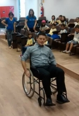 O que é isso? O presidente da Câmara, Pedrinho Nespolo, de cadeira de rodas? É isso mesmo, sem montagem nem nada. Mas calma! Nenhum problema com ele, não. Nespolo só usou a cadeira durante uma palestra sobre acessibilidade para alunos da escola Municipal Maria do Carmo. A criançada esteve na Câmara nesta quinta-feira. Hummmmm...