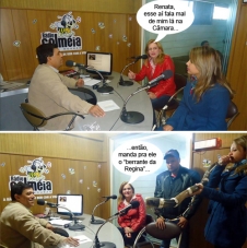 Os cliques são desta terça-feira, quando a prefeita Regina Dubay foi ao programa do vereador Sidnei Jardim, na rádio Colméia, para falar da 24.a Festa Nacional do Carneiro no Buraco. A rainha da festa, Renata Kelly de Souza, foi junto e levou seu inseparável berrante. No programa, só festa, nada de críticas. Ah, milagre do carneiro...