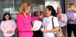 Diminuir as estatísticas de morte de mulheres por câncer e a prevenção contra a doença. Esses são os principais objetivos do Outubro Rosa, que foi aberto nesta terça-feira em Campo Mourão. A cerimônia em frente à prefeitura incluiu homenagem a Solange Vilma. Ela venceu o câncer e recebeu da prefeita Regina Dubay o “chaveiro pela vida”. O Outubro Rosa terá uma programação ao longo do mês, incluindo atendimentos diferenciados nos postos de saúde.