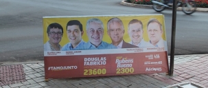 A campanha dos deputáveis Douglas Fabricio (estadual) e Rubens Bueno (federal), do PPS, "inaugurou" na semana passada uma nova placa. Nela, os candidatos aparecem juntos com os três vereadores do partido em Campo Mourão - Elvira Schen, Sidnei Jardim e Edson Battilani - e com o ex-prefeito Tauillo Tezelli. Portanto, tá justificado o slogan "Tamo junto"...
