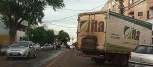 No flagra desta terça-feira, às 16h, o caminhão estaciona, numa boa, na vaga diagonal da rua São Paulo, entre as avenidas Capitão Índio Bandeira e Irmãos Pereira, centrão de Campo Mourão.