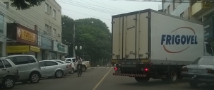 Na rua Brasil, centrão de Campo Mourão, nesta sexta-feira, caminhão estaciona na vaga diagonal e fecha uma das pistas. Isso praticamente em frente à prefeitura. Marlon