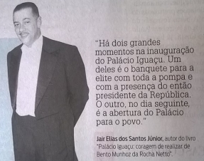 A Gazeta do Povo fez matéria de página inteira, nesta sexta-feira, para lembrar os 60 anos de inauguração do Palácio Iguaçu, a sede do governo estadual. Uma das fontes foi o livro "Palácio Iguaçu: Coragem de realizar de Bento Munhoz da Rocha Netto", do historiador mourãoense Jair Elias dos Santos Jr. O jornal até destacou uma frase dele na matéria, ao lado da foto do governador responsável pela obra.