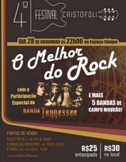 Acontece nesta sexta-feira (22h), no Espaço Unique, o 4.o Festival Cristófoli. Cinco grupos de rock de Campo Mourão vão se apresentar, além da participação especial da banda Tennessee. O convite antecipado custa R$ 25. Na hora será R$ 30. Tem pra vender na Cristófoli, na Fundação Educare e na Fiorella. Toda a renda vai para o Lar Dona Jacira.