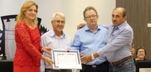 Teve entrega de moção durante a sessão desta terça-feira. Foi para o agricultor Antônio Gancedo, pelo trabalho comunitário na comunidade rural Fazenda Boa Esperança e pelos projetos de turismo rural. A autoria foi dos vereadores Edson Battilani e Isidoro Moraes, que entregaram a moção junto com a prefeita Regina Dubay. Aliás, a prefeita parecia a "Dama de vermelho" do fime dos anos 90. Ah, esses eleitores da Dilma...