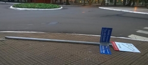 Placa com nomes de ruas amanheceu caída na esquina da av. Capitão Índio Bandeira com a rua Harrison José Borges, no centro de Campo Mourão.