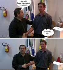 Os candidatos a presidente da Acamdoze, Gilson Martins (Boa Esperança) e Tiago Elicker (Nova Cantu) acompanharam lado a lado a apuração dos votos. A eleição aconteceu neste sábado, com vitória de Martins por 75 a 46. Como manda a democracia, ao final teve o tradicional cumprimento dos candidatos. E viva o barão de Coubertin!...