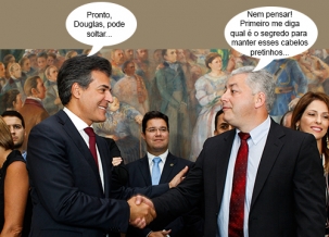 Olha aí mais um clic da cerimônia de posse de Douglas Fabrício como secretário de Estado do Esporte e Turismo. Desta vez ele aparece recebendo os cumprimetos do governador Beto Richa. E que fique claro: cor dos cabelos à parte, Douglas é mais novo...