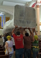 ...é de barro? Não! O São José de cinco metros de altura que será colocado em cima da Catedral de Campo Mourão é de fibra de vidro. Quando chegou à igreja, na quarta-feira, todo mundo teve que ajudar a levá-la até o altar, a começar pelo padre Adilson Naruishi. "Estou com dor nas costas até agora", frisou nesta sexta. Portanto, devagar com o andor que o santo é de fibra. E padre é de carne e osso...