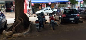 "Na av. Capitão Índio Bandeira, centro de Campo Mourão, nesta quinta-feira à tarde, motos estacionam em vaga destinada a carros".