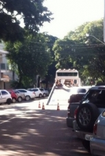 "Rua Mato Grosso, no centro de Campo Mourão, na tarde desta segunda-feira. Caminhão plataforma para no mei da rua e usa cones para interromper o trânsito. Tudo para que um carro pudesse ser "carregado". Pode isso, Arnaldo, fazer essa operação no meio de uma rua central, em horário comercial?"