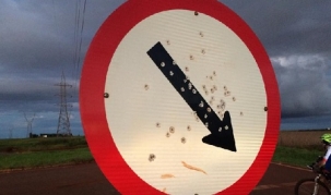 Sinalização de trânsito no começo da BR-158, trecho da chamada estrada velha para Roncador, em Campo Mourão Dá pra contar mais de 50 tiros na placa. Parece que o local virou estande de tiro ao alvo. Ou será que os tiros são de pedras de estilingue?...
