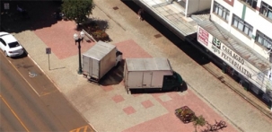 Dois caminhões furgões usam o calçadão, no centro de Campo Mourão, como estacionamento. Isso foi na tarde desta segunda-feira.