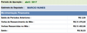 Como a verba de ressarcimento é de R$ 31.470 e tinha R$ 2,59 sobrando de março, o caixa ainda ficou com R$ 20,53.