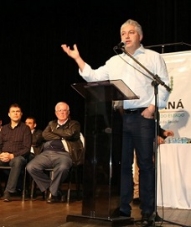 Valdir Rossoni (PSDB), chefe da Casa Civil, num momento rasgação de seda, ao fazer referência aos mourãoenses Márcio Nunes (PSD) e Douglas Fabrício (PPS), durante anúncio de recursos para a saúde; no Teatro Municipal, neste sábado.