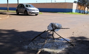 Rua Pitanga, esquina com av. Comendador Norberto Marcondes, em frente ao estádio municipal. Alguém cansou de esperar o tapa-buracos da prefeitura e resolveu o problema por conta própria. É o concreto no buraco.