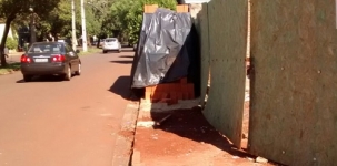 Pilha de tijolos impede a passagem de pedestre pela calçada, na av. José Custódio de Oliviera, centro de Campo Mourão.