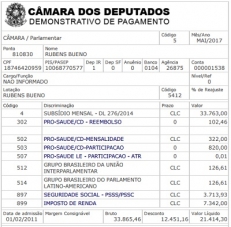 O deputado federal Rubens Bueno publica todo mês, em seu site oficial, o holerite da Câmara dos Deputados. Esse aí é o de maio. O subsídio total foi de R$ 33,7 mil, mas com descontos o que sobra dá R$ 21,4 mil. Entre os descontos tem R$ 7,3 mil de Imposto de Renda e R$ 3,7 mil de Previdência.