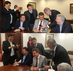 Repare que Sidnei Jardim registra a cena com seu celular. Ao lado o vereador Miguel Ribeiro observa tudo. O deputado Márcio Nunes e o secretário Douglas Fabrício também aparecem nos cliques. Pela risada, parece que o governador gostou da historinha...
