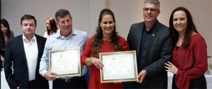 Quatro vereadores participaram, neste sábado, da sessão solene que entregou moções ao casal Ataídes e Márcia Hatum Casarolli. A entrega aconteceu no hotel Santa Maria. O coronel Ataídes foi comandante do 11º BPM e a homenagem a ele tinha mais de 10 anos, proposta ainda nos tempos da vereadora Marla Tureck. Márcia foi homenageada pela atuação como enfermeira da rede pública. A moção a ela foi proposta pelo vereador Miguel Ribeiro. O vice-prefeito Beto Voidelo representou o prefeito Tauillo Tezelli.