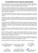 Confira na íntegra da carta que selou o acordo entre periquitos e borboletas, em Araruna. Os padres Raimundo Santana e Pedro Speri assinam o documento junto com prefeito atual (periquito), o ex-prefeito (borboleta), o pré-candidato a prefeito (borboleta) e o pré-candidatoa vice-prefeito (borboleta).