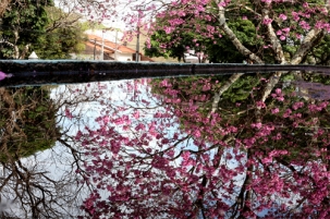 Na av. Goioerê, ipê roxo reflete na água da chuva que caiu na madrugada desta quarta-feira. Dirceu Portugal