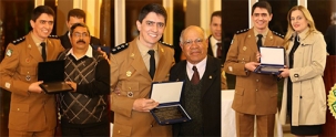 Não faltaram placas de homenagem ao capitão Leandro Calegari durante a solenidade em que ele se despediu do comando do Corpo de Bombeiros de Campo Mourão. Ele recebe uma placa do pessoal do quartel, uma do Conselho de Segurança e outra da prefeita Regina Dubay. Viu só, que “placaiada”?...