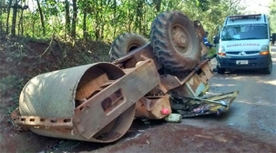 Quem disse que é só carro leve que capota? Olha só o que aconteceu com esse rolo-compactador na estrada que liga Roncador a Iretama. Capotou no meio da pista. A informação é que o trator ficou sem freios e o condutor jogou a máquina pra cima do barranco. Apesar do estrada todo, o operador teve apenas ferimentos leves.