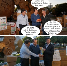 O Dia Internacional do Cooperativismo (2 de julho) foi marcado na Coamo pela entrega de donativos a entidades assistenciais. Foi o Dia C - Dia de Cooperar, que reuniu milhares de funcionários e cooperados. Em Campo Mourão, os beneficiados foram a Santa Casa e o Lar dos Velhinhos. Olha aí os presidentes João Ernesto da Silva e José Carlos Laurani recebendo as doações das mãos do presidente José Aroldo Gallassini.
