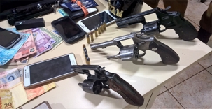 Esses três revólveres aí foram apreendidos pela Polícia Militar após um assalto a ônibus entre Mamborê e Boa Esperança. Quatro homens e duas mulheres foram presos pouco depois. Um ladrão levou tiro no braço. O ônibus ia de São Paulo a Foz do Iguaçu, com 15 passageiros, mas eles não eram sacoleiros, o que irritou os ladrões, que não encontraram todo o dinheiro que esperavam. Todos os objetos roubados foram recuperados.