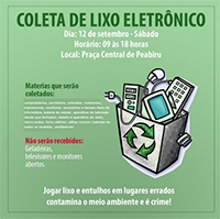Peabiru – Acontece neste sábado a coleta de lixo eletrônico. Será na praça Eleutério Galdino de Andrade, das 9h às 18h. Podem ser levados computadores, impressoras, monitores, bateria de celular, aparelhos de televisão desde que fechados, rádios, micro-ondas e pilhas comuns.