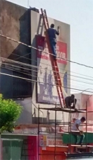 “Cadê a segurança desses trabalhadores? Não usavam nemhum tipo de equipamentos, A escada estava solta no cavalete. A foto é desta quarta-feira pela manhã, na av. Capitão Índilo Bandeira, centro de Campo Mourão”;