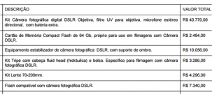 Apenas duas câmeras, que também fazem filmagens, vão sair por R$ 43,7 mil, mais uma lente por R$ 4,2 mil.