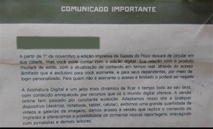 Olha só o recado que a Gazeta do Povo está mandando para os assinantes de Campo Mourão e região. A partir do próximo dia 1º não tem mais a versão impressa por aqui, não. Os assinantes, se quiserem, ganharão uma senha para verem o conteúdo da internet, sem limitações. Bancas de revistas também já foram avisadas que o jornal deixará de ser vendido na cidade. Alguma dúvida que esse é só o começo do fim da impressão?...