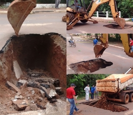 Olha só o tamanho do buraco que estava por baixo do asfalto na cabeceira da ponte sobre o Rio do Campo. Isso no encontro da rua Roberto Brzezinski com o jardim Araucária. O buraco “apareceu” nesta quarta-feira e, segundo a prefeitura, foi feito um trabalho emergencial para dar condições de passagem no local.