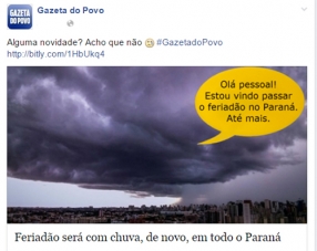 Quem disse que é só a Boca Santa que fez balãozinho. A Gazeta do Povo entrou na onda nesta quarta-feira e colocou um balão sobre um nuvem de chuva sobre Curitiba. Tudo para brincar com o fato da previsão estar falando em chuva, de novo, para o feriadão deste fim de semana. A brincadeira saiu na página da Gazeta no Facebook.