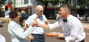 Cena diferente neste sábado, no centro de Campo Mourão. Um casal de garçons servia sucos, salgadinhos, doces e sushis. Tudo para quem passasse pelo local. Mais de dois mil petiscos e 20 litros de suco foram distribuidos. Era o lançamento da revista “Gastronomia & Turismo de Campo Mourão e Região”. Aliás, todo mundo pode levar um exemplar pra casa. Portanto, quando a “esmola é demais”, pode ser apenas uma simpática estratégia de marketing...