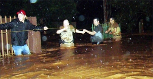 Choveu mais de 100 milímetro nesta quinta-feira em Mamborê, o córrego que leva o nome da cidade, próximo ao perímetro urbano, transbordou e atingiu casas e empresas. Um motorista que tentou atravessar a ponte de acesso ao residencial Colina Alta teve que desistir e subir no teto do seu Fiat Uno para não se afogar. Policiais militares e populares usaram uma corda para resgatar o morador.