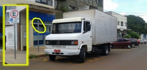 Rua Mato Grosso, centro de Campo Mourão, nesta quinta-feira. Caminhão estaciona em vaga reservada para portadores de deficiência física.
